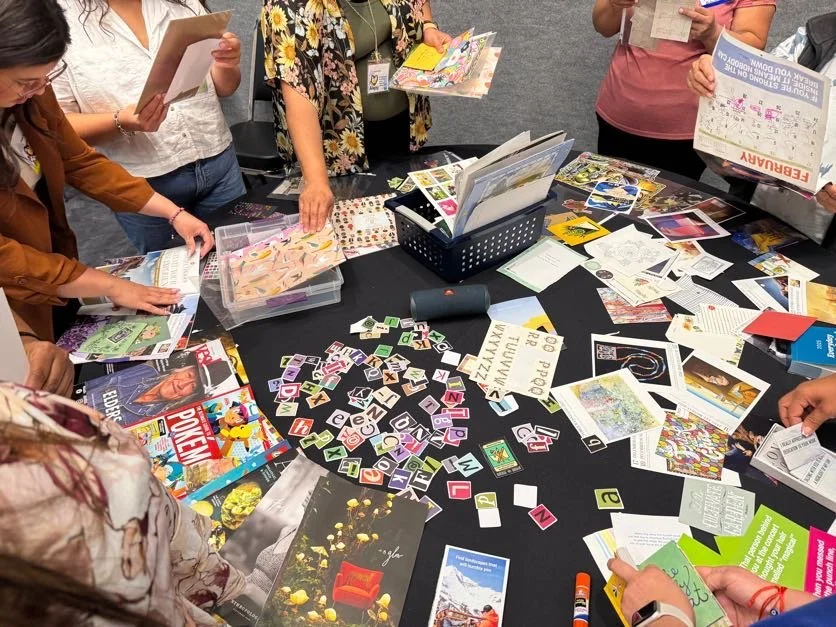 Our workshops were also enriched by the influence of Hanncel Sanchez and Kiantha Duncan. Hanncel’s Spanish/English affirmation cards highlighted the power of language in belonging, while Kiantha’s book Excavating The Soul: A Journey Through Trauma Informed Healing sparked reflection and conversation that rippled through the room. Their work reminded us that creativity often begins with inspiration from others.